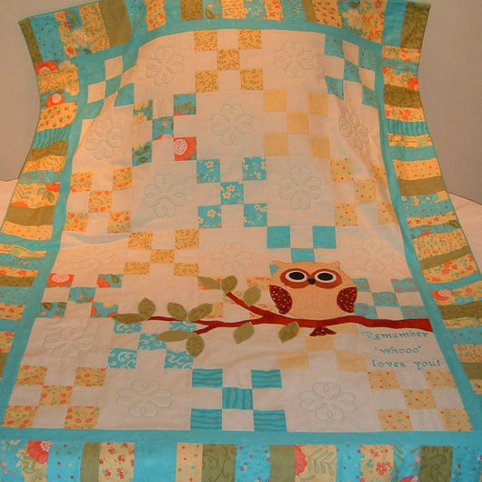 A wise owl sitting on a branch with a perfect patchwork background and a wise saying. Whoo could want more? For more information about this quilt please contact me or telephone me on 07798 895783