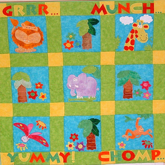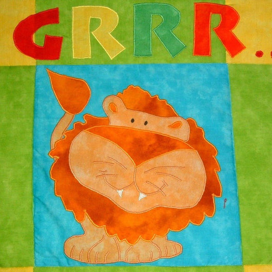 This custom made quilt combines bright, primary colours with patchwork and fun jungle animals. The sounds of the jungle are featured around the outside. If you would like a custom made jungle quilt made to your specifications please get in touch - I'd love to hear from you.