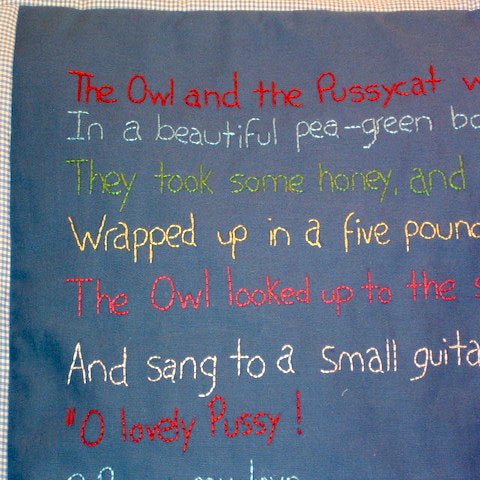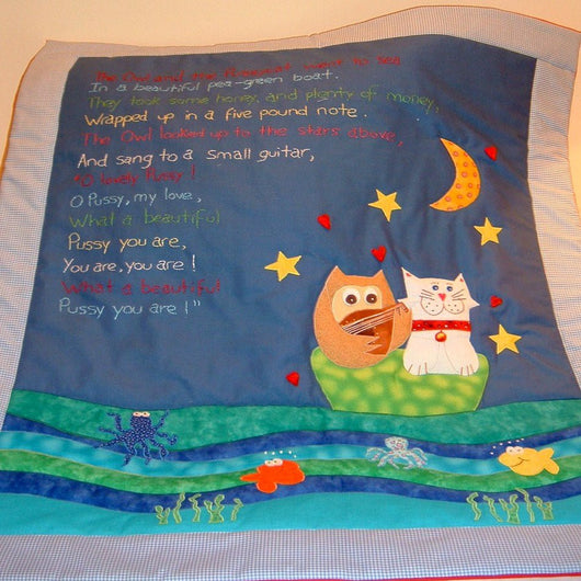 This custom made nursery rhyme quilt is of the classic The Owl and the PussyCat and of course the Pea Green Boat. It comes complete with the nursery rhyme sewn on it. If you would like a custom made nursery rhyme quilt please contact me - I'd love love hear from you.