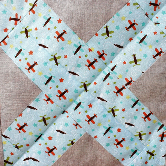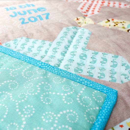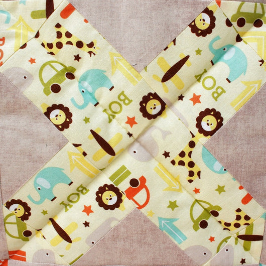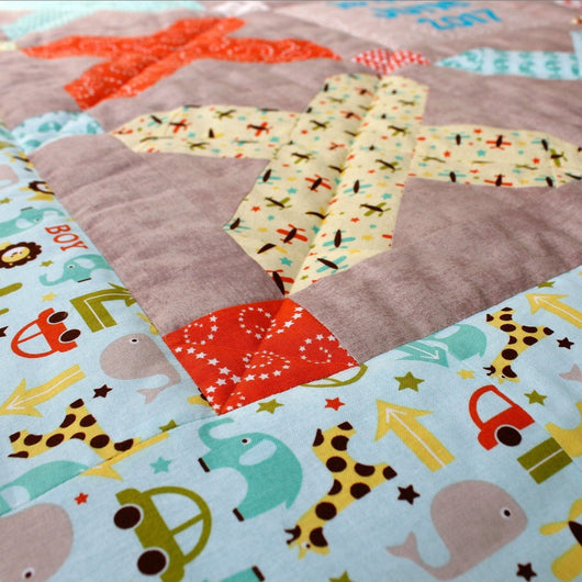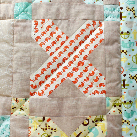 a close up photo of the baby quilt showing blue border fabric with elephants, cars, whales and giraffes printed on it. There is a yellow cross made up of patchwork squares