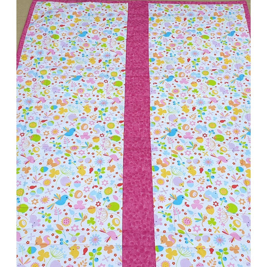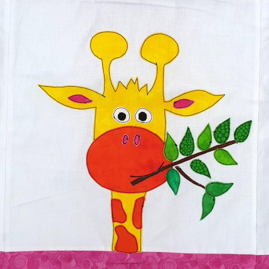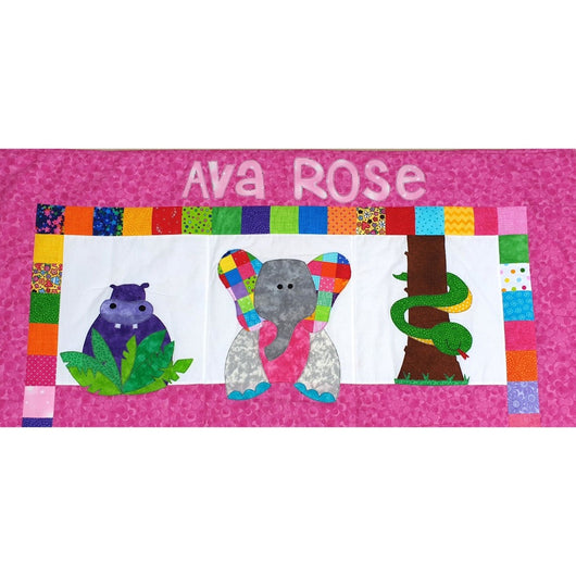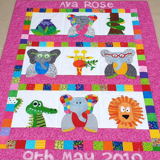 This custom-made personalised Jungle Quilt was made for a newborn baby girl. It is personalised with her name and date of birth and celebrates everything jungle. It's fun and bright and of course pink! It measures 127cm x 160cm.