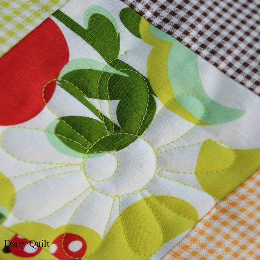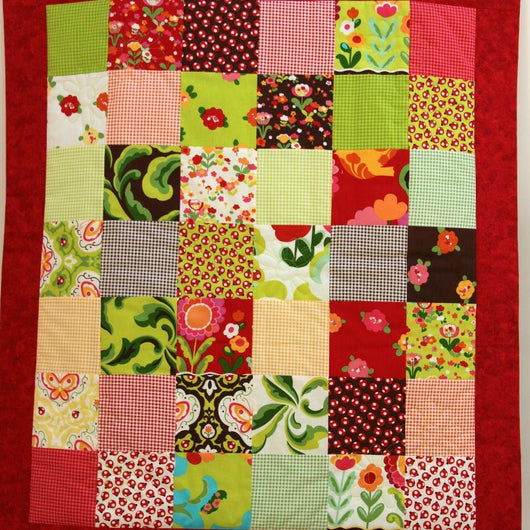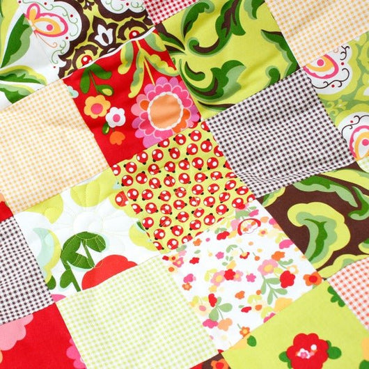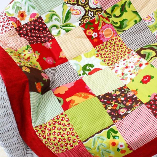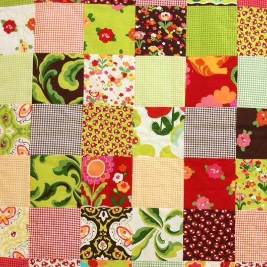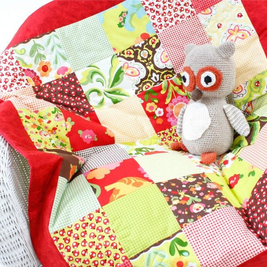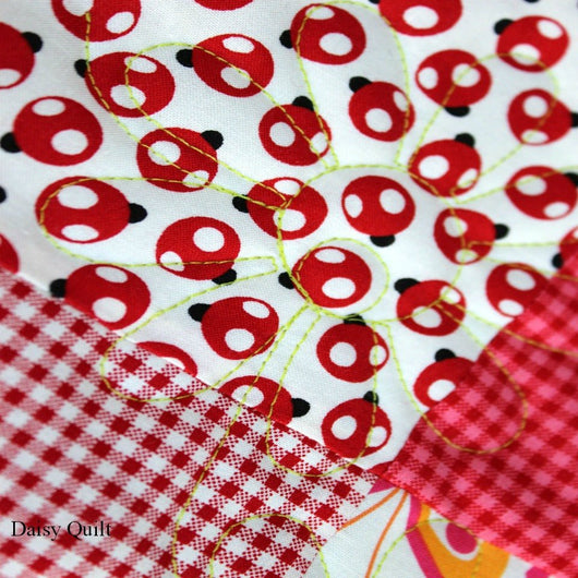 This traditional patchwork quilt is bursting with flowers, ladybirds and leaves. The flowers squares combine with gingham square in red, pink, yellow and brown. The quilt measures 82cm wide and 93cm long and is just perfect for a little girl.